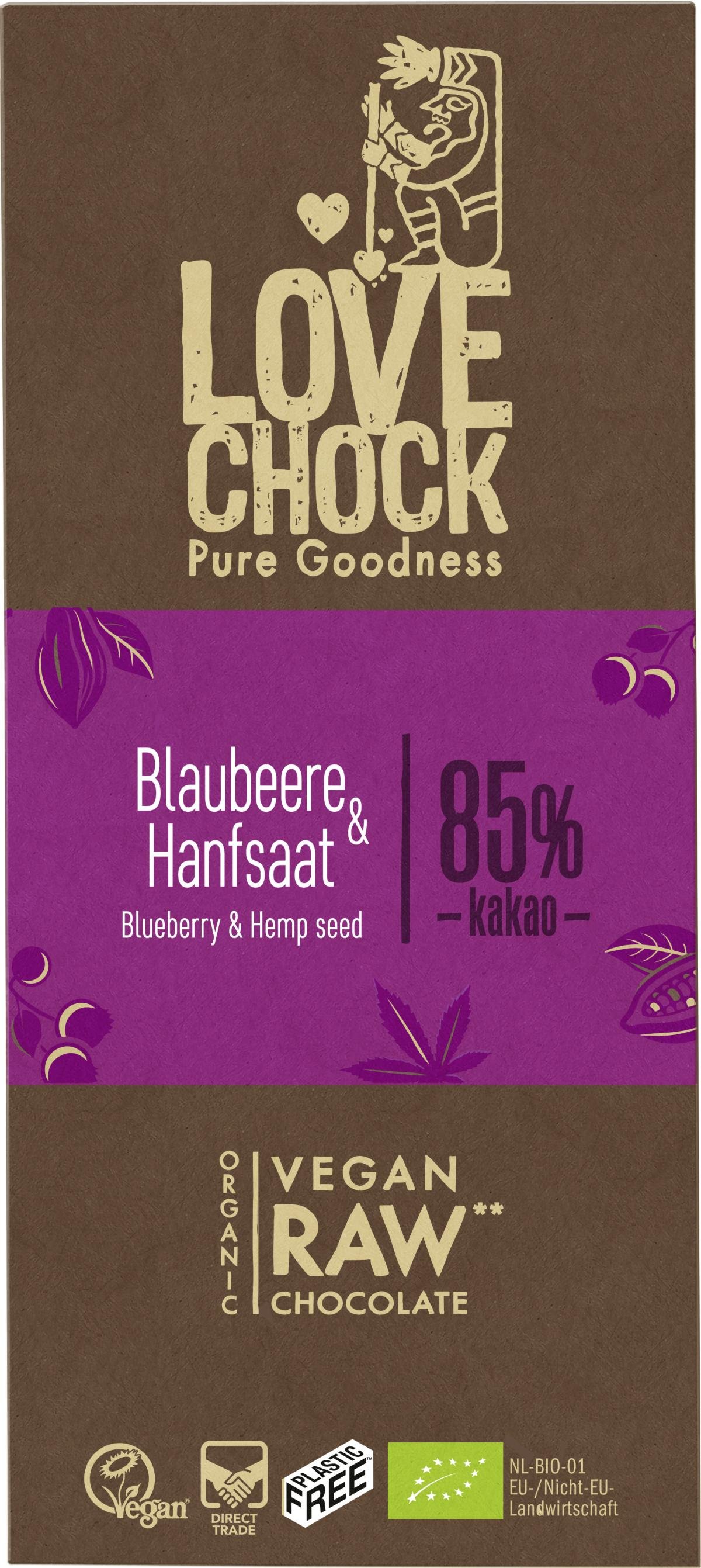 Leicht nussige Note von Hanfsaat trifft auf das fruchtig-frische Aroma von Blaubeeren. Bio, vegan, mit Rohkakao aus Direct Trade